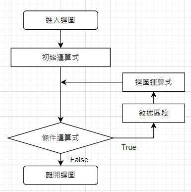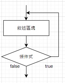 後側式迴圈(會先做一次迴圈內的事情,做完一次後才會去判斷條件式是否為True,如果為True則繼續執行, 如果為False則跳出迴圈