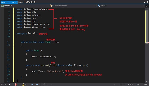 拉一個Button、Label到From1中。好了之後快速雙擊Button進入程式碼頁面