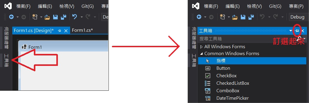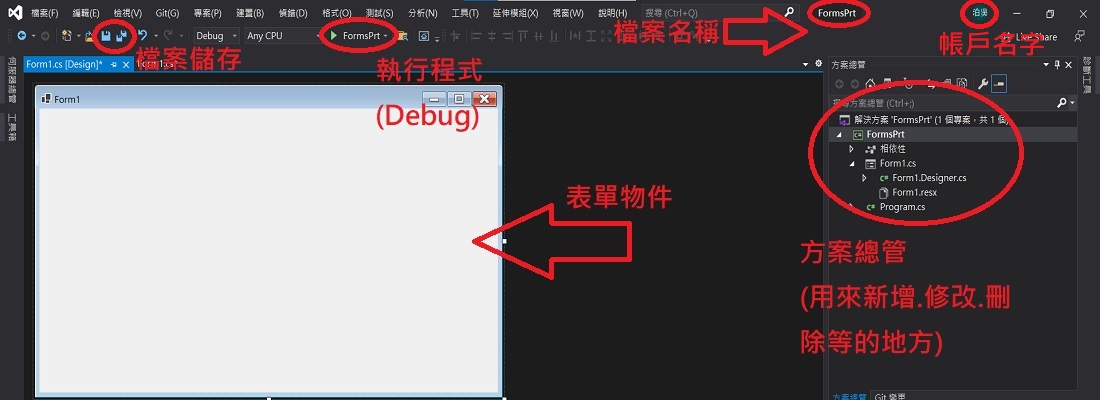 本章節會介紹Visual Studio的基本操作,並且會說明各按紐的功能。