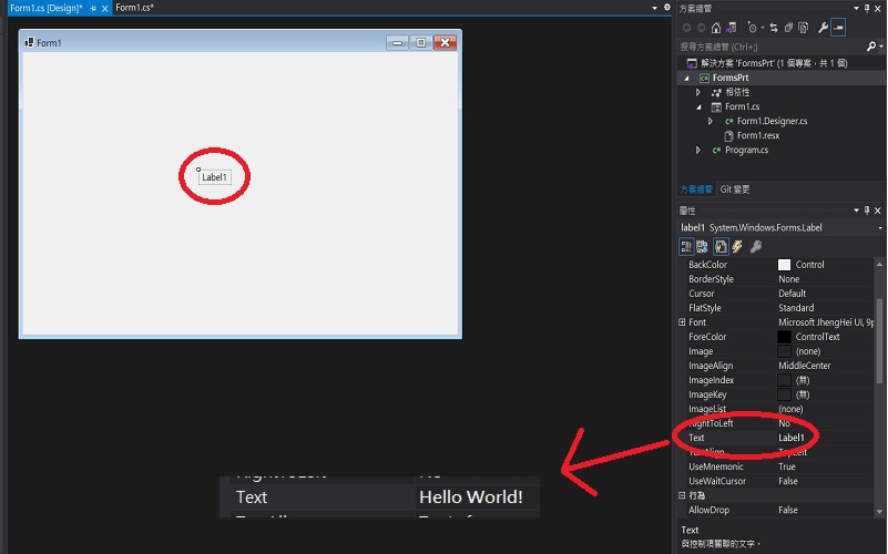 下一步,單擊Label1的文字,右下角會跳出屬性視窗,找到Text的屬性後,改成"Hello World!"