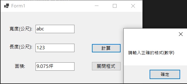由於這一段有寫 try...catch,所以如果輸入錯誤,會跳出訊息視窗